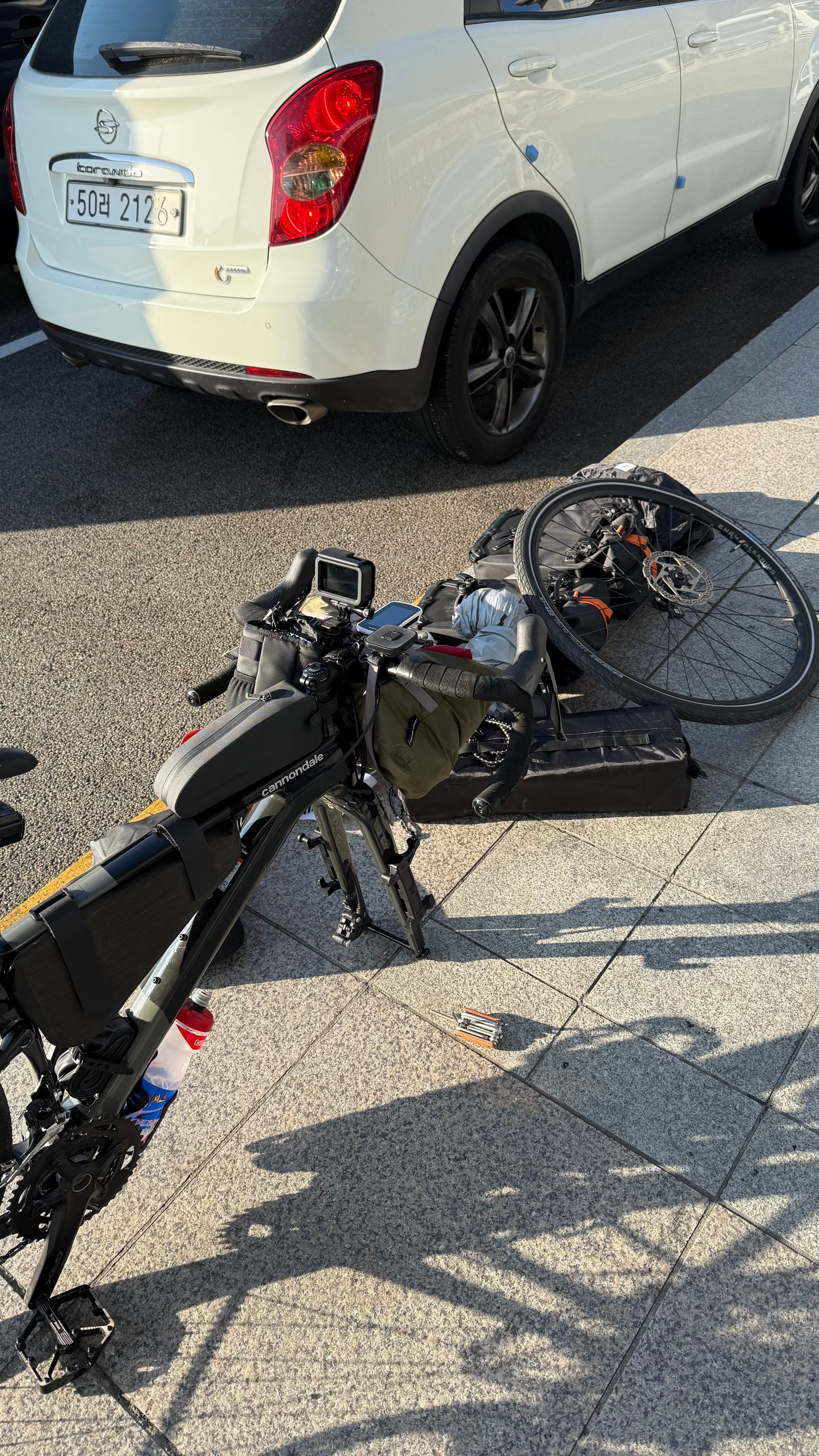 셋째로는, 이게 가장 심각한데 뒷바퀴 바람을 넣던 중에 부품 하나가 실종됐다. 다음날 알고 보니 펌프에 부품이 끼여있었다. 그런지도 모르고 나는 바람 소리가 강하게 났으니 당연히 하늘로 날아간 줄 알고 근처를 한참 뒤졌다. 결국 부품을 찾지 못하고 뒷바퀴 바람을 못 넣었다. 바람을 못 넣는다는 건 자전거를 탈 수 없다는 말이다. 자전거를 탈 수 없다는 건 숙소로 못 간다는 말이다.