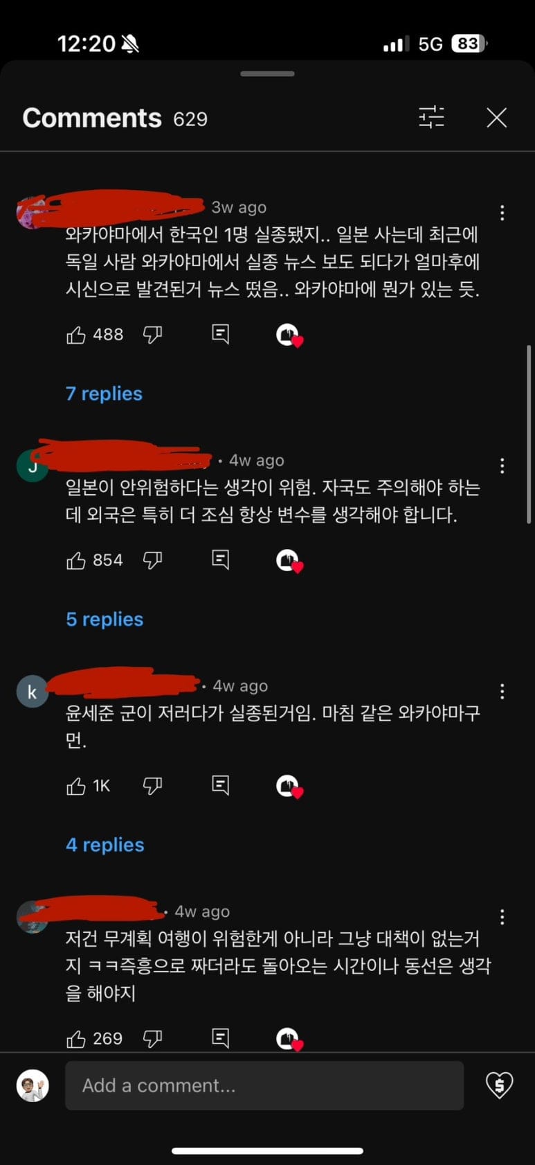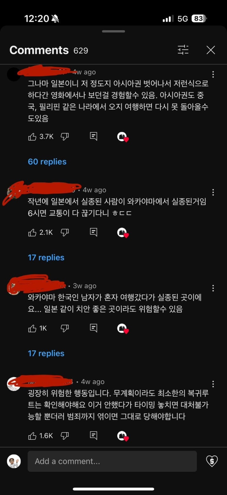 며칠 전에 “일본 무계획 여행이 위험한 이유”라고 해서, 일본 소도시를 계획 없이 여행하다 전철이 끊겼다는 내용의 짧은 숏츠를 본 적이 있다. 당장 댓글만 봐도 이런 상태이다. 조심해서 나쁠 건 없다지만 당장 나만해도 저것보단 위험한 여행을 하고 있고 지금 당장에도 수만 혹은 수십만의 사람들이 훨씬 더 도전적인 여행을 하고 있을거다.