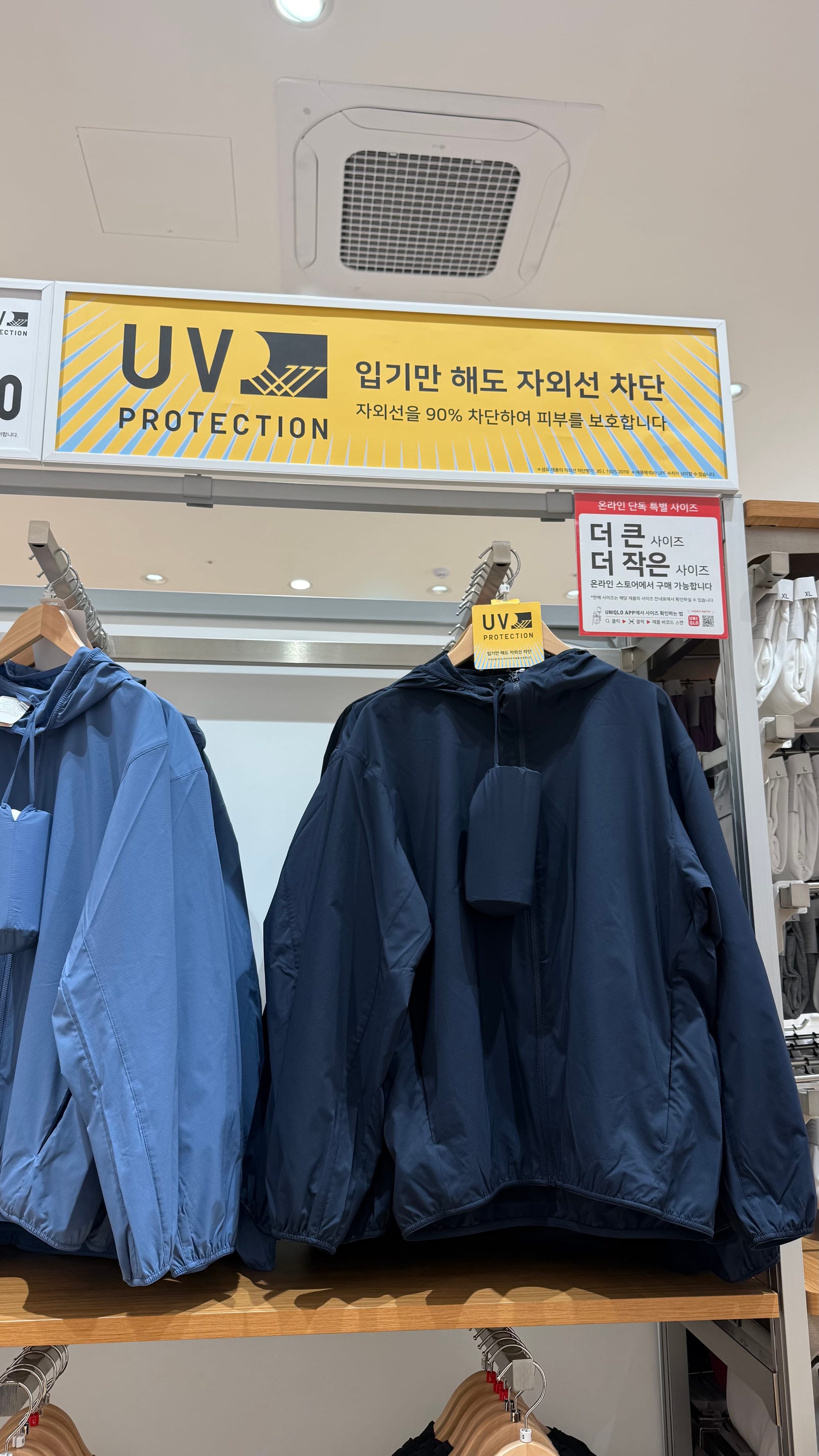 유니클로의 이런 옷들은 자체 품질 검사를 해서 자외선 차단률을 명시해둔다. 매장에 걸려 있는 설명에는 90%의 자외선을 막는다고 되어있는데 이는 환산해보면 UPF 10밖에 되지 않는다. 실제로는 UPF 수치가 훨씬 더 높은데 최대한 보수적으로 단순화해서 이렇게 걸어놓았다.