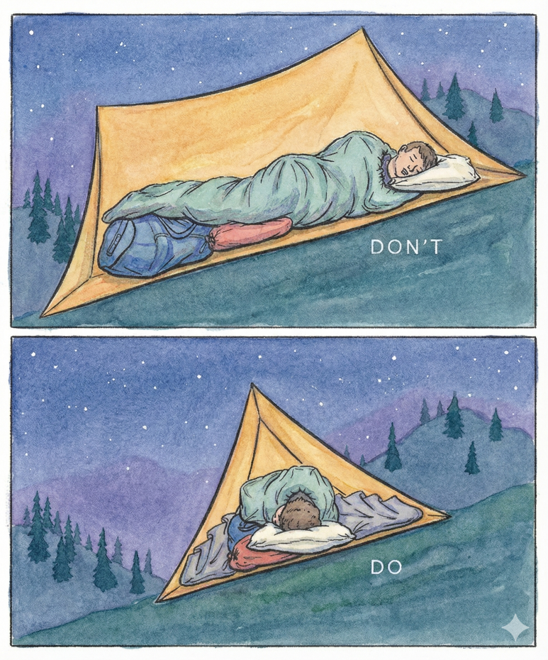 - 경사가 약간 있다면 머리가 약간 위로 향하게 하는 게 좋다. 매트 밑에 옷과 같이 부피가 있는 물건을 넣어서 수평을 맞추면 편하다.