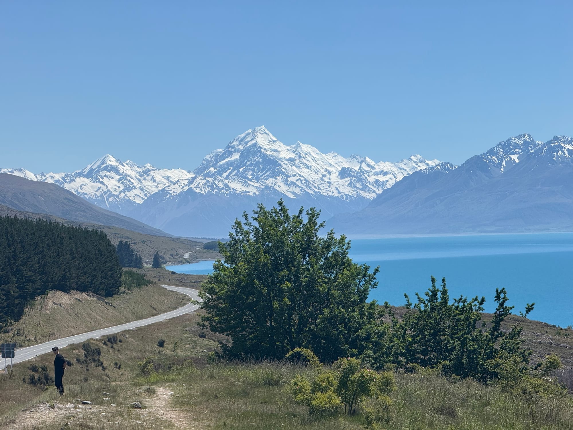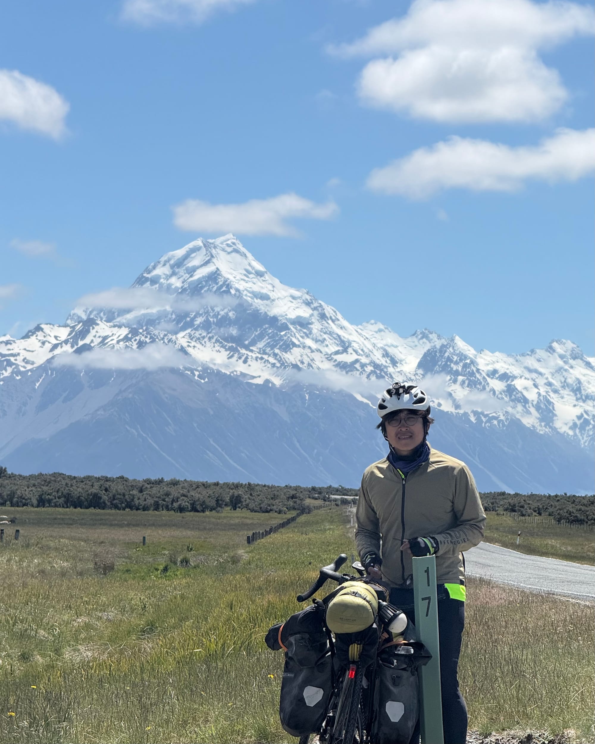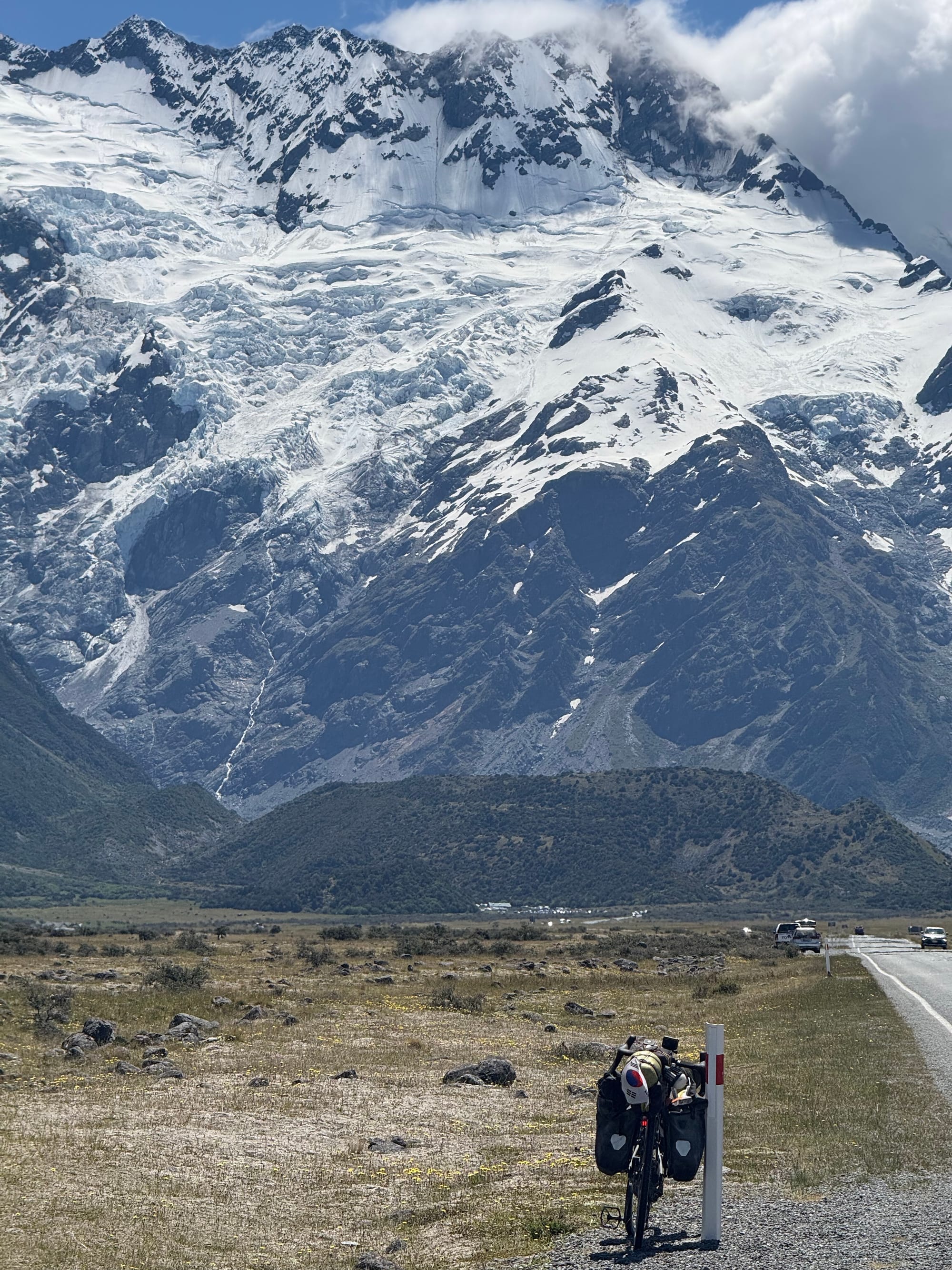 마운트쿡과 트위젤 사이에는 기가막힌 위치에 전망대가 하나 있는데 내가 자전거를 타고 그쪽으로 향하니 대포만한 카메라를 든 사람들이 우르르 내려와 내 사진을 찍었(는 듯 했)다. 기막힌 우연의 타이밍일지도 모르지만 만약 내가 그런 카메라를 들고 있었더라도 자전거를 타고 오는 사람이 있었다면 저 배경으로 사진을 찍었을 것이다.