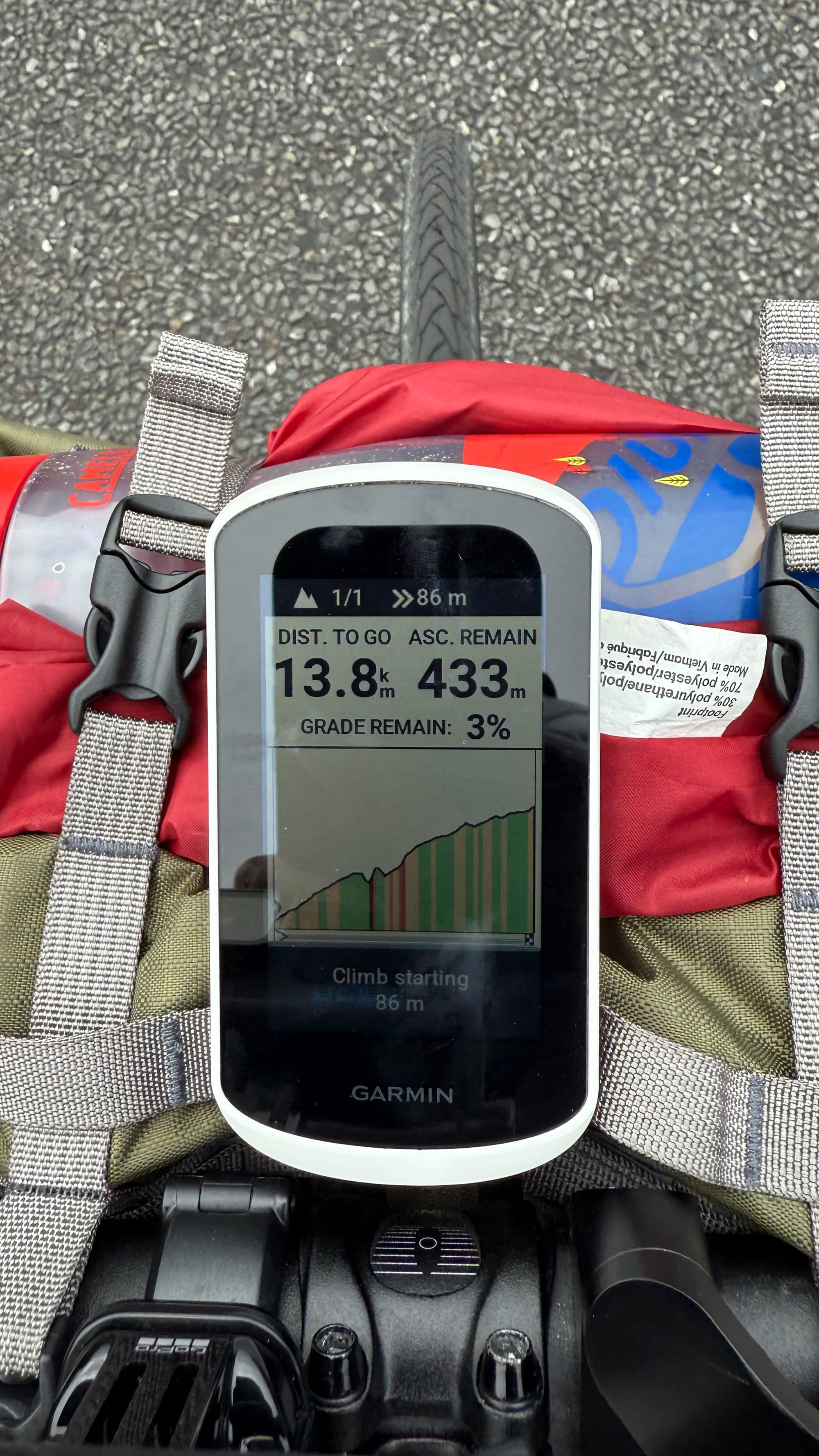 점심을 먹지않고 계속 페달을 밟는다. 난생 처음 겪어보는 13.8km의 오르막도 넘는데 정말로 죽는 줄 알았다. 오르막도 오르막인데다가 길도 구불구불하고 갓길도 없는데다 차도 쌩쌩달려대니 자칫하다간 요단강행이다. 내 경험상 자전거는 오르막이 내리막보다 훨씬 위험하다. 오르막에서는 자전거와 차의 속도차이가 많이 나고 경사가 심한 곳은 길을 구불구불하게 만들어서 차 운전자의 시야도 넓지 않다. 긴장하고 오르막을 올라 손에 쥐가 난다.