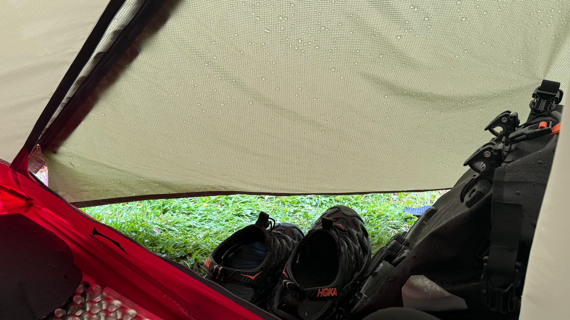비와서 텐트 안에 고립