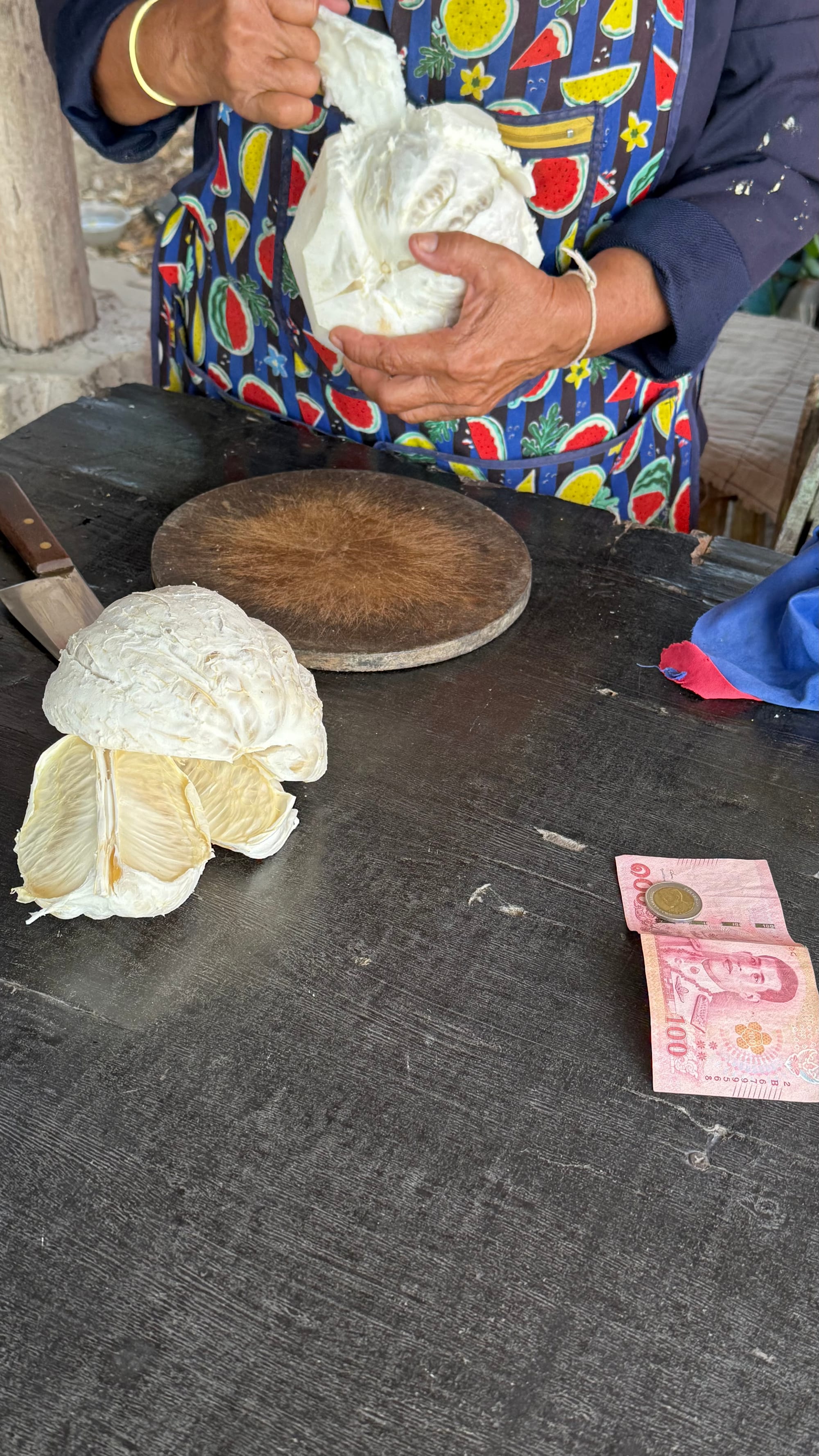 태국 사람이 친절하고 착하다는 얘기를 많이 들어왔었는데 직접 경험하면 마냥 그런 것만은 아니다. 내가 관광객이고 태국어를 못하니 물건을 살 때 나를 호구 취급하는 경우가 있다. 오늘 오는 길에 길가에 할머니에게 자몽과 비슷한 포멜로라는 과일 하나를 샀었다. 무게를 달더니 108바트라고 한다. 태국 하루 일당이 350 바트인데 이건 순 사기가 아닌가. 그래도 할머니가 직접 깎아주기도 하고 뭐 경험이라 생각하고 샀었다. 한 두배 정도 눈탱이 맞은건가 당시에 생각했었는데 한 세배 정도 가격을 주고 산거였다.
