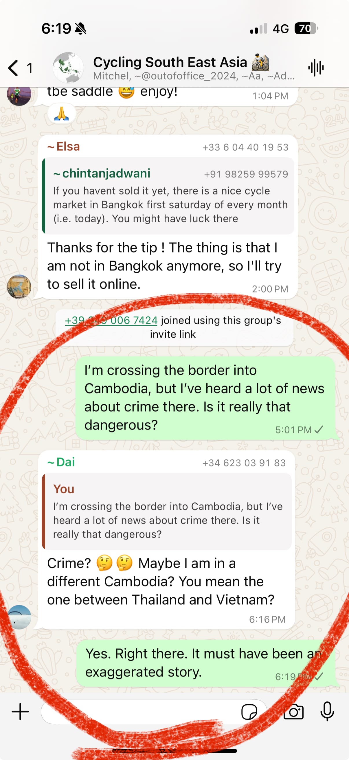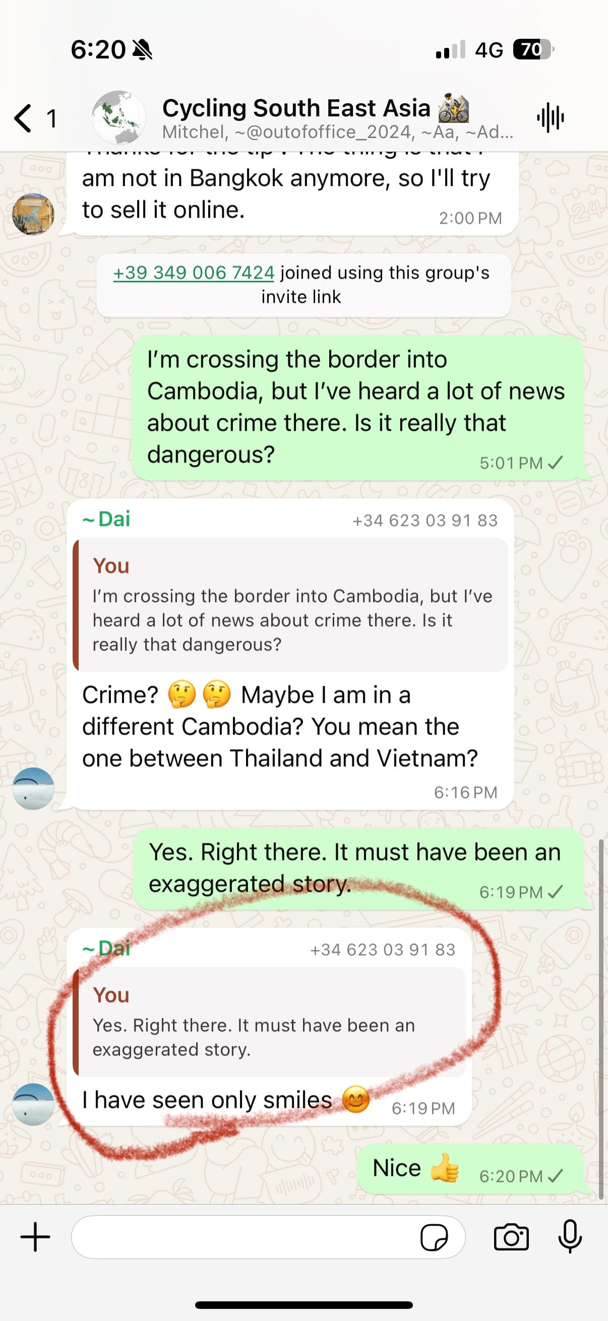 왓츠앱에 “Cycling South East Asia”라는, 자전거로 동남아 여행하는 사람 수백명이 들어와있는 단톡방이 있다. 며칠 전 캄보디아 입국이 조금 두려워 위험하지 않냐는 질문을 한 적이 있는데, 누군가의 대답