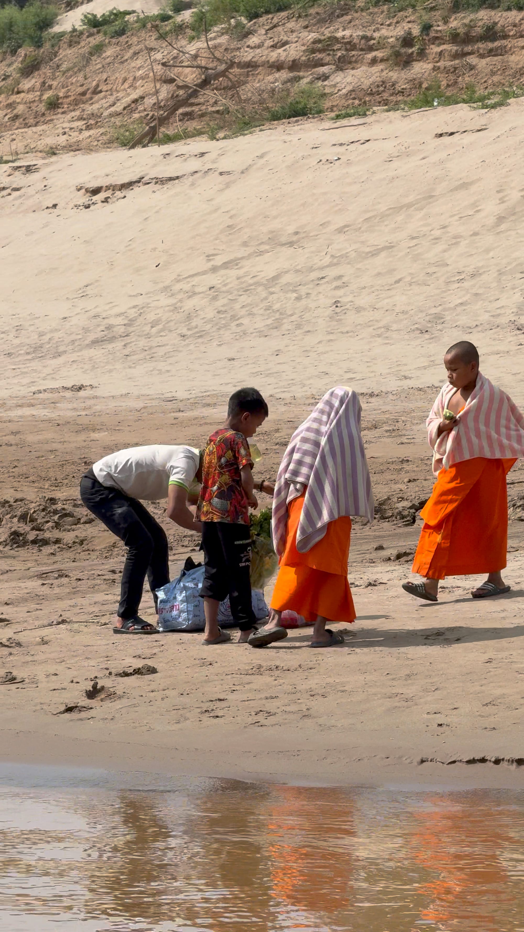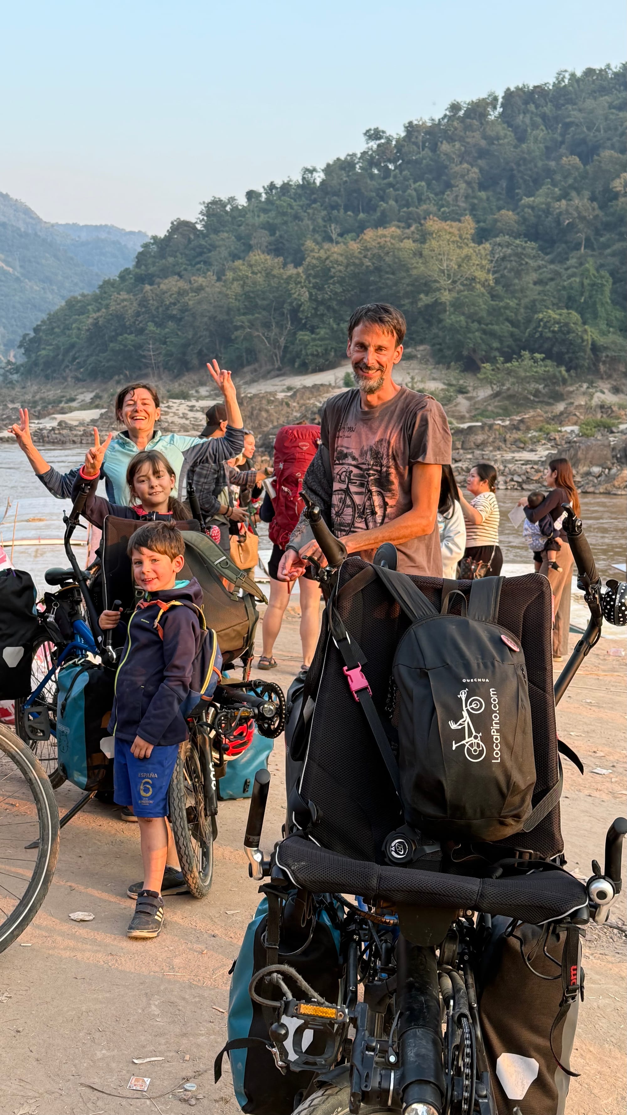 한참을 달려 오후 5시 쯤 팍벵이란 마을에 도착했다. 나중에도 여러번 느꼈지만 라오스 사람들은 선착장을 일부러 교묘한 위치에 만들어 놓는 거 같았다. 시내랑 약간 떨어진 곳에 지어서 툭툭이를 타고 이동할 수 밖에 없는 그런 위치 말이다. 유튜브 영상을 보니 시외버스정류장도 그런 위치인 듯 했다. 그저께 치앙콩으로 오는 길에 웬 부부 자전거 여행자가 특이한 구조의 자전거를 타고 앞 좌석에는 꼬마 아이들을 둘 태우고 달리는 것을 본 적이 있는데 그 여행자들을 여기서 만났다. 한국에도 갔다왔다고 하고 총 6개월 동안 이 어린 아이들을 태우고 자전거 여행을 하는 프랑스 부부이다. 이런 사람들을 볼 때마다 내 마음 속에 불안이 사라지는 것을 느낀다.