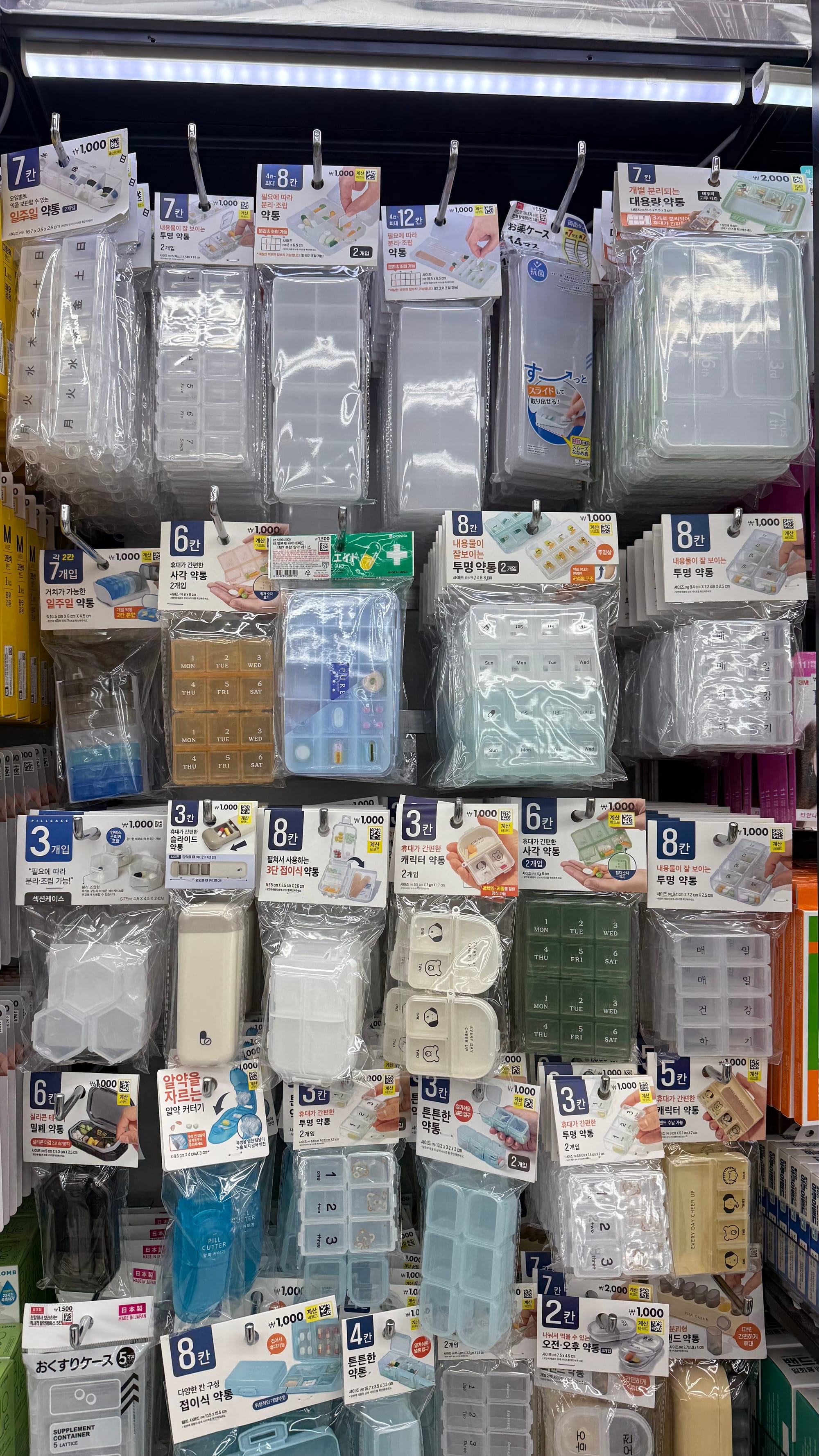 다이소에 가면 위와 같은 약 통들을 많이 파는 걸 볼 수 있는데 위의 통들은 아웃도어 용으로는 부적합하다. 많은 통들이 복약순응도를 높이기 위해서 요일별로 칸막이를 쳐서 약을 나눠놓았는데 습기를 제대로 차단할 수 없어보인다.